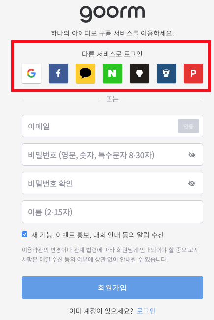 혹시, 해당 서비스들 중 계정이 하나도 없거나, 계정 연동이 싫으시다면, 이메일을 아이디로 하여 새롭게 회원가입 하시면 됩니다.