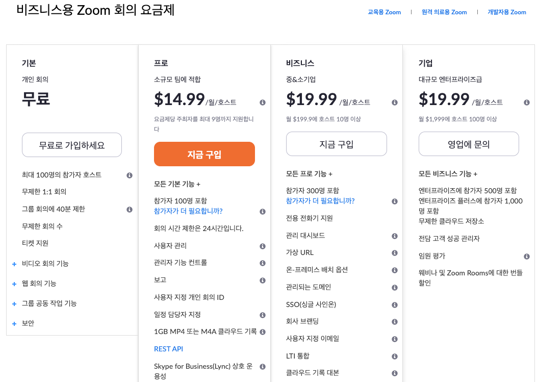 한 가지 단점은 무료 사용버전의 제한사항이다. 무료사용은 1:1회의 또는 그룹회의 경우, 40분으로 제한 된다. 온라인 회의 경험이 있는 분들을 아시겠지만, 다자간 온라인 회의가 1시간이 넘어가는 경우가 많다.무료 버전의 경우, 2인 이상 소규모 그룹회의 일지라도 40분만에 종료된다. 혹, 40분 이내로 진행한다고 하더라고, 40분에 종료된다는 제한사항으로 마음을 졸이게 될것 이다.