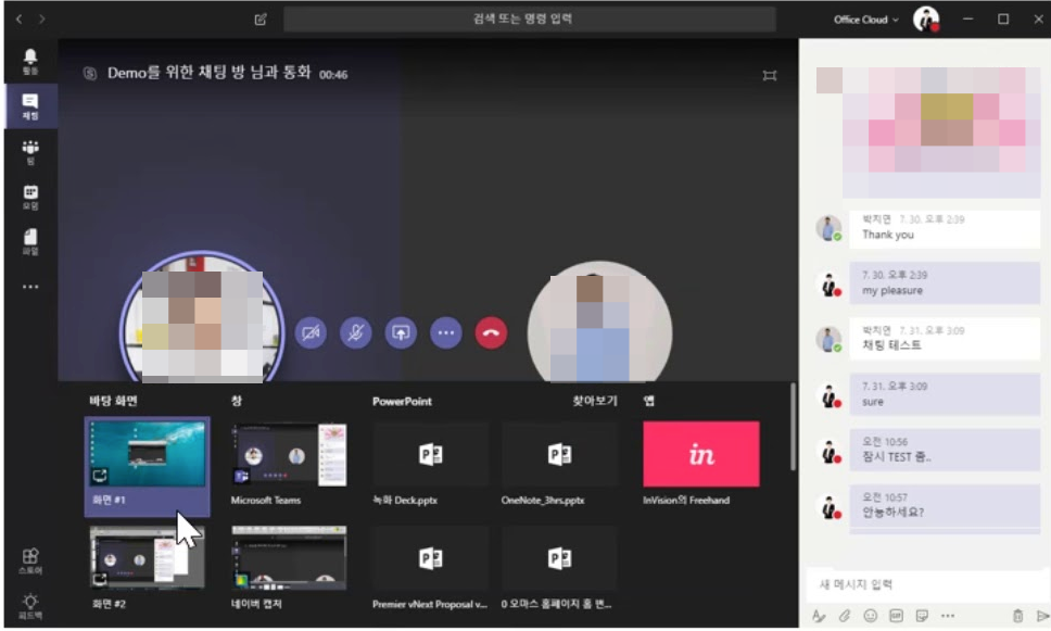 화상회의를 진행하면, 아래 화면처럼 다자간 화상 회의와 우측에 채팅을 진행할 수 있다.