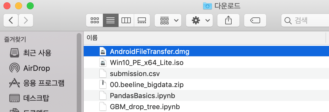 다운로드 폴더에 보면 이런 AndroidFileTransfer.dmg가 다운로드 되어 있는 것을 확인할 수 있다.