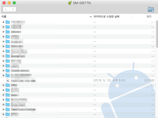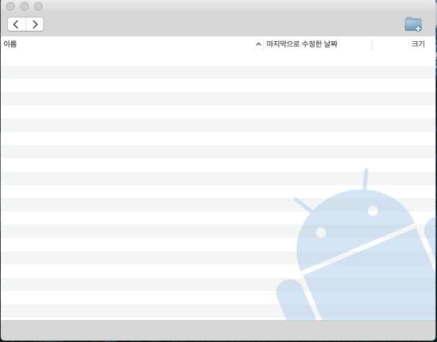 응용 프로그램 폴더 또는 바탕화면에 있는 Android File Transfer를 실행 한다. 혹은, USB로 안드로이드 폰을 연결하면 자동을 오픈된다. 정상적으로 설치가 완료되면 아래와 같은 폴더/파일 리스트를 볼 수 있다.