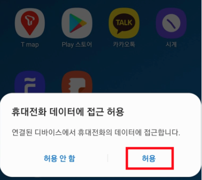 3) 접근 허용 팝업 창이 뜨지 않았을 경우, 스마트폰 잠금해제를 한 상태에서, USB를 뺐다가 다시 연결하고 스마트폰 화면을 보면 팝업창이 뜰것이다.