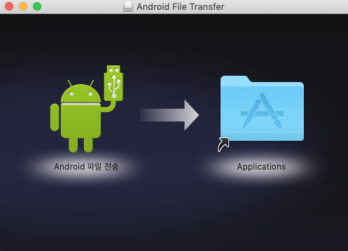 AndroidFileTransfer.dmg를 더블클릭 하면, 맥북사용자에게 익숙한 설치 창이 오픈된다. "Android 파일 전송"을 "Applications"로 드래그& 드랍 해 주자.