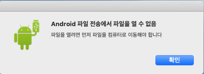 원하는 폴더를 찾아가서 폴더를 열 경우, 최초 오픈시 파일을 검색하는 데 시간이 좀 걸릴 수 있다. 원하는 파일을 맥북(MacBook)으로 복사해와서 사용한다. 해당 프로그램은 파일전송 프로그램이기 때문에 복사하지 않고 바로 실행은 지원을 하지 않는다. ㅜ_ㅜ. 만약 바로 실행하려고 더블 클릭을 하면 다음과 같은 팝업창을 볼 수 있다.