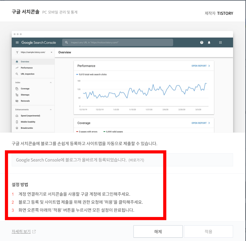티스토리의 플러그인 설정이 끝나면, 구글서치콘솔에 방문해서 제대로 적용이 되었는지 재확인해 보도록 하자. 만약 플러그인이 제대로 등록되지 않았다면, 자신으 블로그는 검색이 되지 않을 것이므로 최종 적용 모습을 확인해 주자. 공부도 할 겸