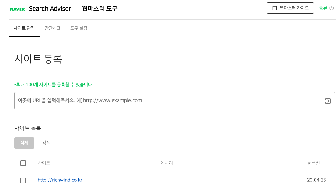 네이버 Search Advisor 서비스로 들어와 우측 상단에 웹마스터 도구 버튼을 눌러 줍니다. 웹마스터 도구에 사이트 관리 항목에서 사이트를 등록할 수 있습니다. 아래 필자의 경우, 필자의 사이트 URL http://richwind.co.kr 을 등록해 준 결과 입니다.