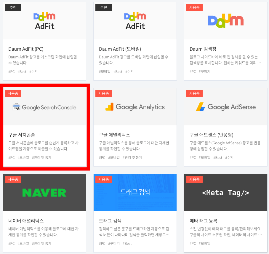 앞에서 언급 했듯이, 티스토리는 플러그인으로 구글서치콘솔 (Google Search Console) 등록을 지원한다. 별도 Google Search Console에 가서 개별 등록 및 설정하는 수고로움을 덜 수 있다. 이용할 수 있는 것은 최대한 이용해 주도록 하자. 티스토리의 "관리메뉴 > 플러그인" 메뉴로 이동하면, 다음과 같이 다양한 플러그인이 제공되고 있다. 이 중에서 구글서치콘솔(Google Search Console) 을 찾아서 클릭해 주자.