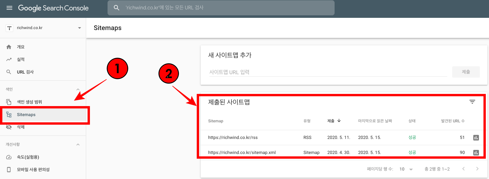 3) 우측 제출된 사이트맵에 자신의 웹사이트 URL이 제대로 등록되어 있는지 확인한다.