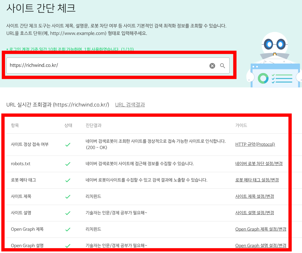 추후 진행 예정입니다만, 메뉴중에 간단체크 항목으로 진입하면, 점검하고자 하는 사이트가 얼마나 구조화 및 최적화가 되었는진 항목점검해 주는 기능이 있습니다. 최소한 아래 기준