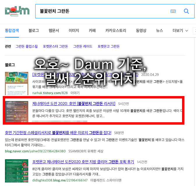 앞서 언급했듯이, 다음(DAUM) 검색엔진에는 별도 웹마스터도구를 사용하지 않아도 알아서 등록해 준다. Tistory가 동일한 기업 서비스이니 자동으로 처리해 주는 것 같다. Daum 기준으로 동일 키워드(Keyword) 2순위까지 올라왔다.
