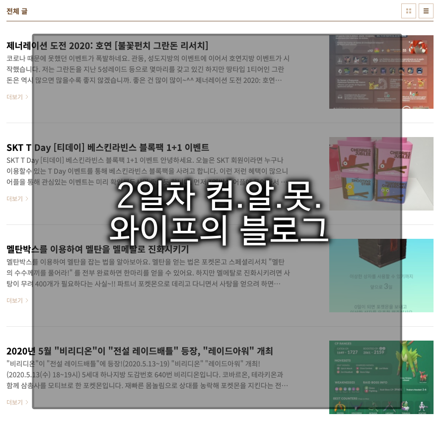 와이프님의 블로그 2일차 결과물은 아래와 같다. 와이프님께서 URL을 공개하면 밥 없다~~ 라고 말씀하셔서, 일단 URL을 공개하지는 않는다.