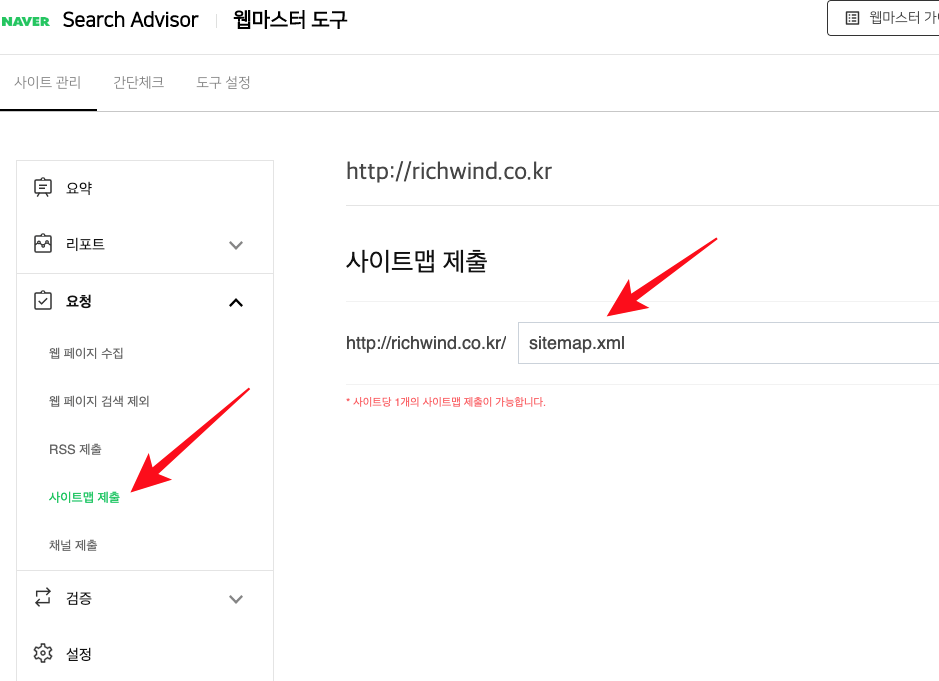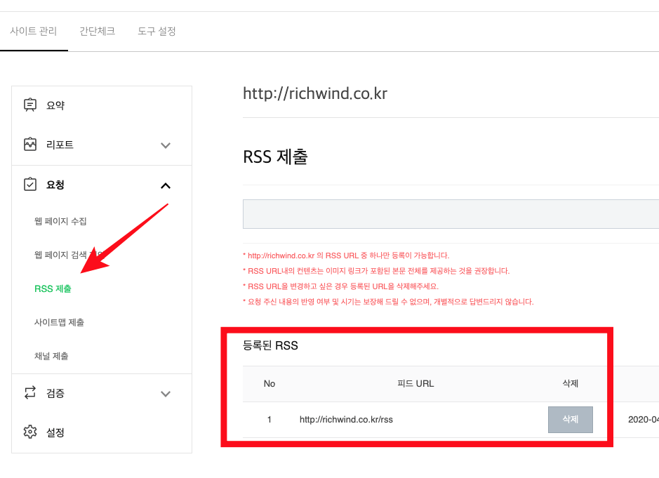 "요청" 메뉴로 이동하면, 사이트맵 제출, RSS 제출 현황을 확인 할 수 있으며, 웹페이지에서 검색 제외 URL을 등록도 가능하다. 요청 메뉴에서 사이트맵이 정확한 sitemap.xml로 등록되어 있는지 확인하자. 또한, RSS가 등록이 되어 있지 않다면 등록해 주도록 하자.