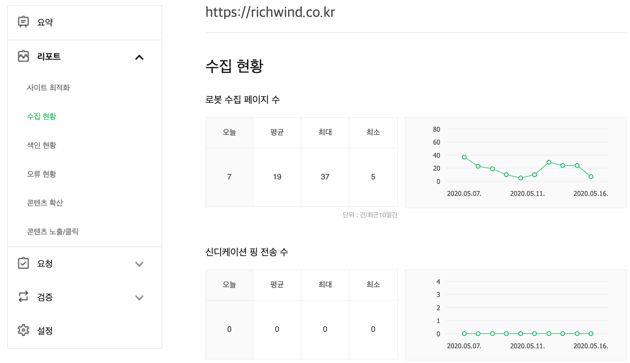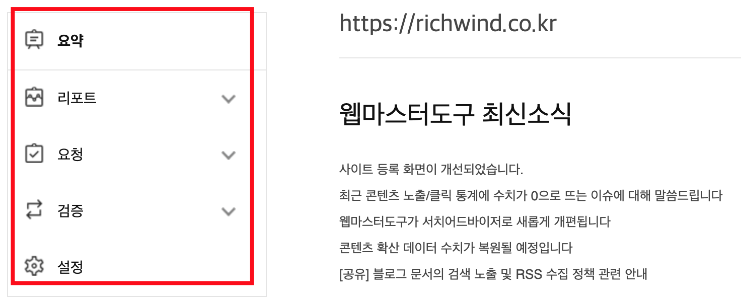 사이트 등록이 완료 되면, 사이트 목록에서 등록한 사이트 URL을 클릭하여, 사이트별 웹마스터 도구로 이동 한다. 웹사이트 상세 내용으로 이동하면, 사이트 최적화 / 수집현황 등 웹사이트별 검색엔진의 상세 페이지를 확인할 수 있다.