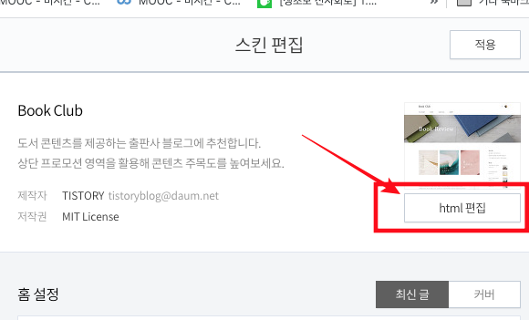티스토리 > 관리 메뉴 > 꾸미기 메뉴 > 스킨 편집 으로 이동하고, 우측 화면에서 "html 편집" 버튼을 누른다.