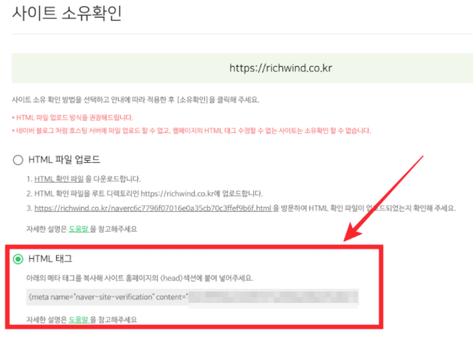 네이버에서 사이트 URL을 등록하면 다음과 같은 화면을 볼 수 있다. HTML 태그 방식을 선택 (라디오버튼 선택)한다.