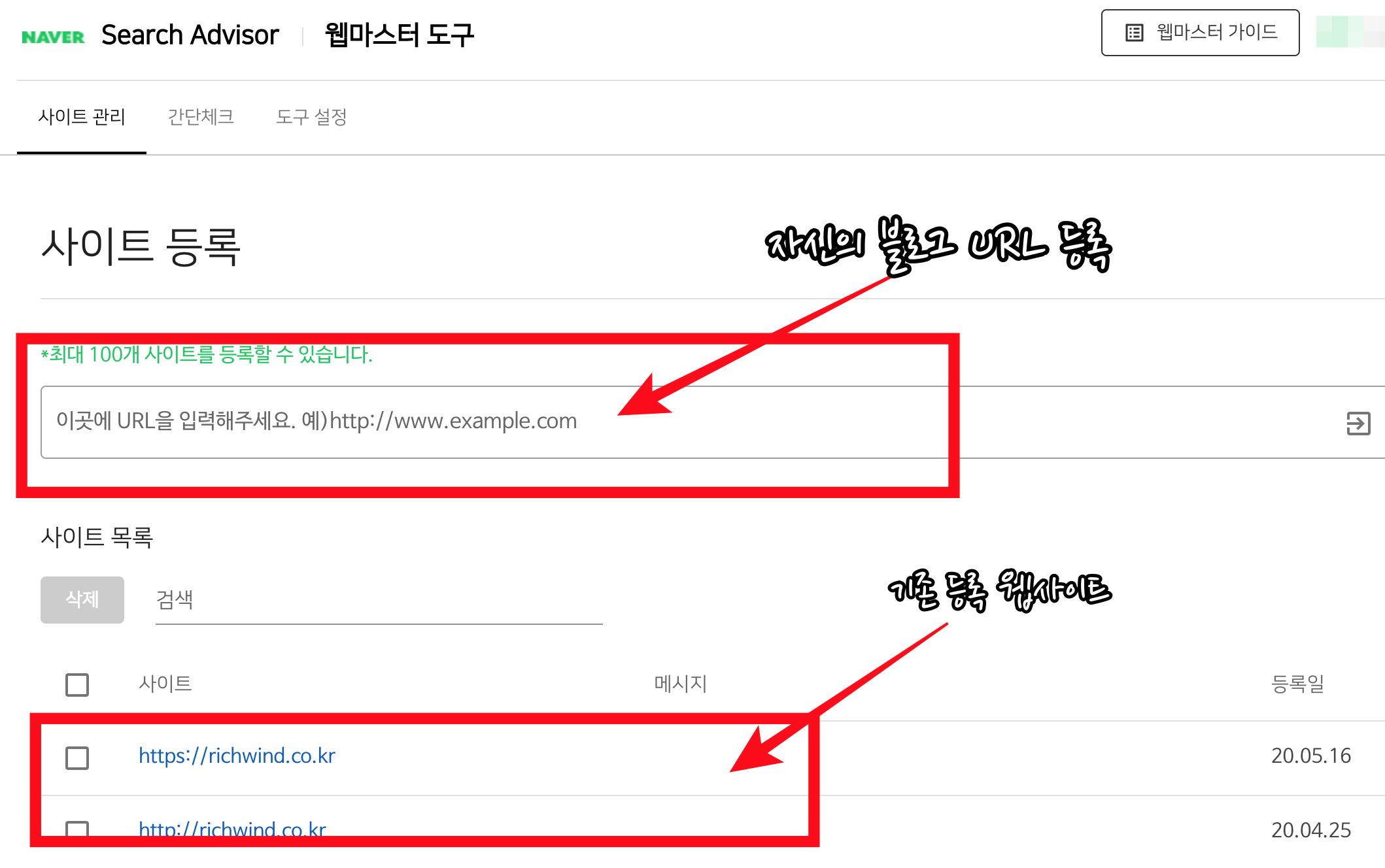 상단의 메뉴 중, 사이트 관리 페이지로 들어오면, 사이트 등록 창을 확인 할 수 있다. 해당 창에 본인의 웹사이트 주소(도메인)를 등록하면 된다. 하단에는 기존에 등록이 완료되어 있는 웹사이트/블로그의 주소를 확인 할 수있다.