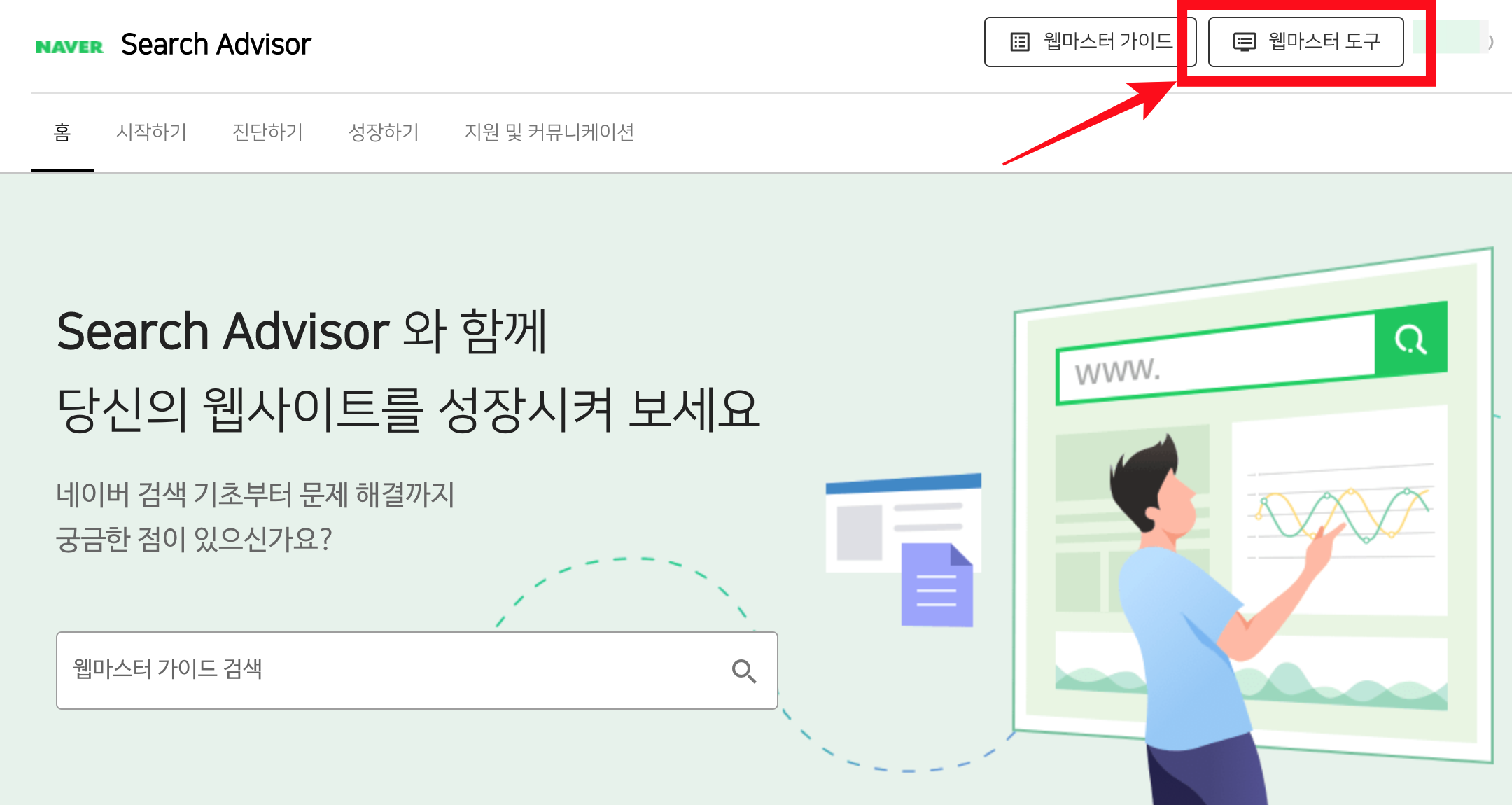 네이버 서치어드바이저 사이트로 들어가서 로그인 후, 우측 상단에 있는 "웹마스터 도구"를 클릭한다.