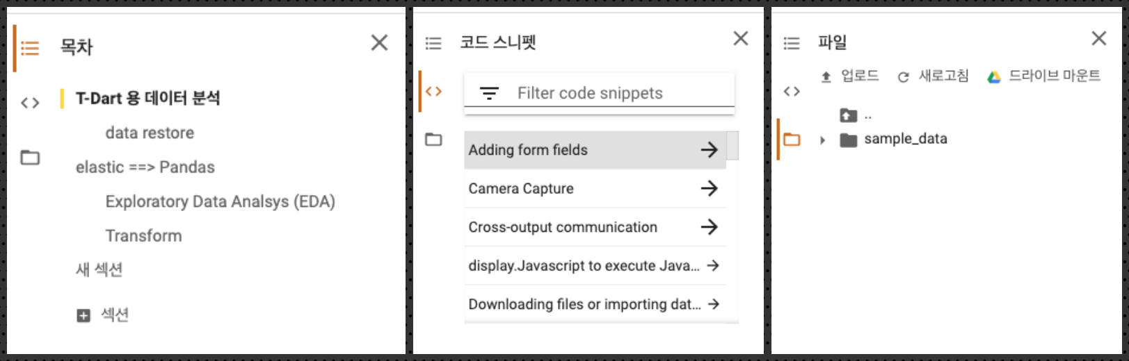 왼족 페널을 하나씩 눌러보면, 1) 목차패널, 2) 코드스니펫 패널, 3) 파일 패널을 열 수 있다.