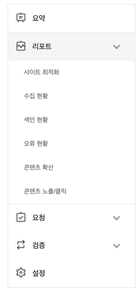 전반적인 상태는 점검/확인을 해 보았으니, 다음으로 왼쪽 사이트 메뉴에 있는 리포트 메뉴 > 하위메뉴에서 상세 점검을 진행하도록 한다. 엄밀히 말하면, 각 하위 메뉴는, 위에서 보았던 "간단체크" 내용에서 우측 하단에 "자세히" 버튼을 눌러 이동한 것과 동일한 항목들이다. 여러가지 메뉴들 중에서, 이번 포스팅은 "사이트 최적화", "콘텐츠 확산", "콘텐츠 노출/클릭"들을 살펴볼 예정이다. 그러나, 나머지 수집 현황, 색인 현황 등 다른 메뉴들도 둘러보길 권고한다.
