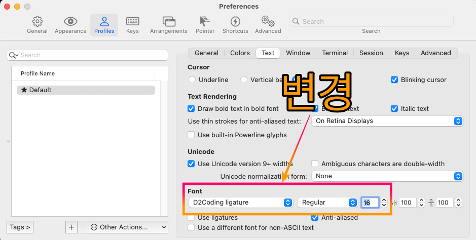 기본 윈도우 사이즈 변경 : Profiles > Window > Setting for New Windows (좌), 기본 폰트 크기 변경 : Profiles > Text > Font