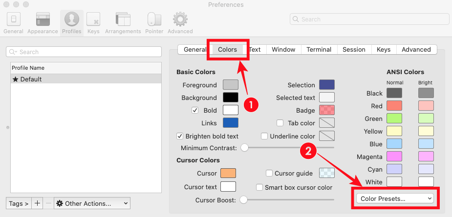 Preferences > Profiles 메뉴를 선택하자.  우리는 Colors 탭과, Text 탭을 기본적으로 설정할 것이다.