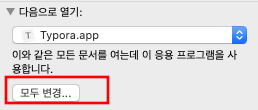 다음으로 열기 의 드랍다운 버튼을 눌러서, 원하는 App를 지정한다. 필자의 경우, Typora라는 마크다운 에디터를 사용하기 때문에, Typora.app를 선택하였다.