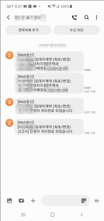 렌트홈의 기준과 가이드에 따라서 그간 누락된 임대차 계약에 대하여 자진 신고를 완료하면, 1~2일 내로 다음과 같은 문자 메세지를 받을 수 있으니, 꼭 확인 하고 최종까지 완료 되었는지를 모니터링 해 줍시다.
