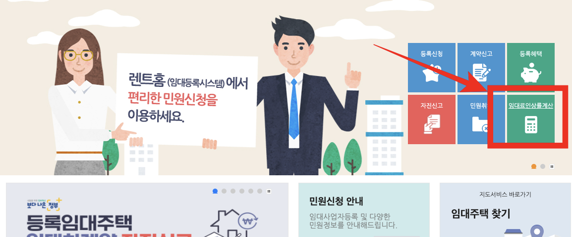 렌트홈 공식 홈페이지 우측에 보면, "월임대료 인상률 계산기" 라는 메뉴가 있습니다.