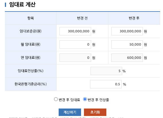 다음은 렌트홈 (Renthome) 사이트에서 제공하는 보증금 및 월임대료 인상률 계산기 입니다.