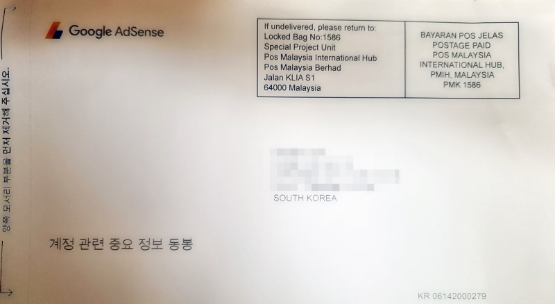 애드센스는 청구서 주소를 확인하기 위해서 실제 우편으로 PIN 번호를 발송한다. (특별한 일이 없으면, 3주 내외로 편지가 한장 온다.) 실제 배송된 우편은 아래와 같이 생겼다.