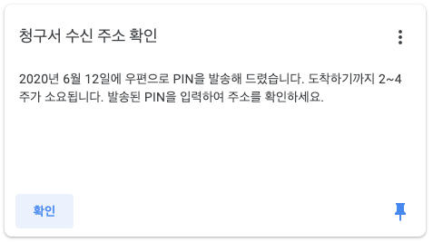 요기에서 스크롤을 조금 더 내리면 다음과 같은 "청구서 수신 주소 확인" 카드 (대시보드 상자)를 볼 수 있을 것이다.