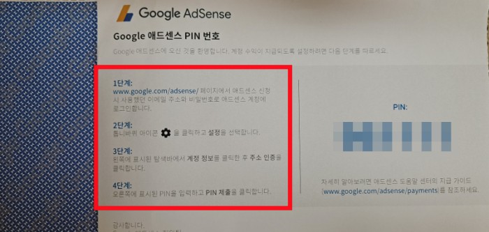 PIN 우편물을 받은 후 다음 안내에 따라 애드센스 계정에 PIN을 입력하세요.