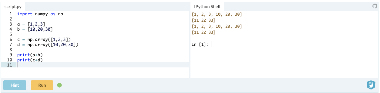 아래는, 일반 Python Array와 Numpy Array의 덧셈 결과를 출력하였습니다.