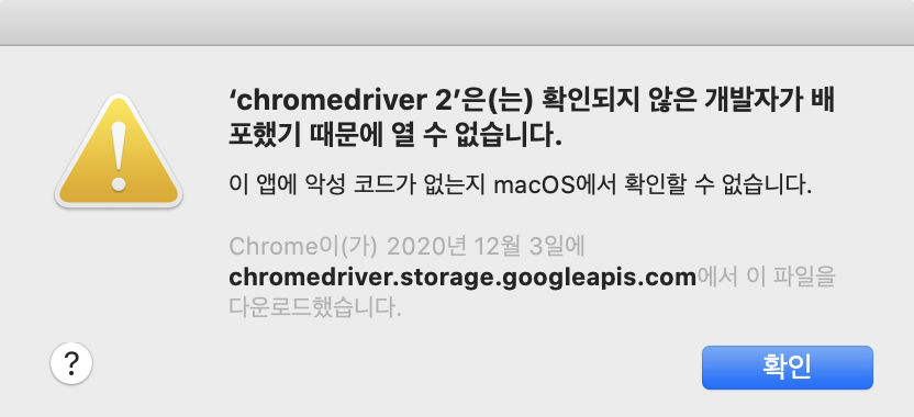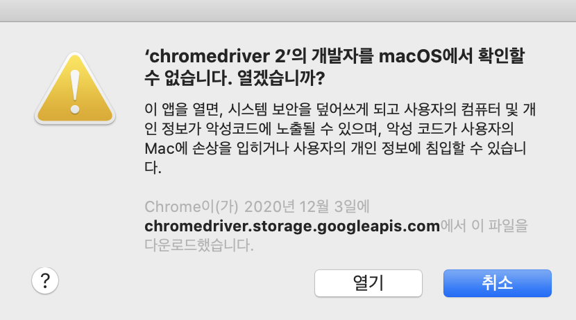 저는 크롬 웹드라이버 공식 사이트에서 다운로드 하고, Hash를 확인을 하였기 때문에 안전하다고 판단하고 설치를 진행합니다.
