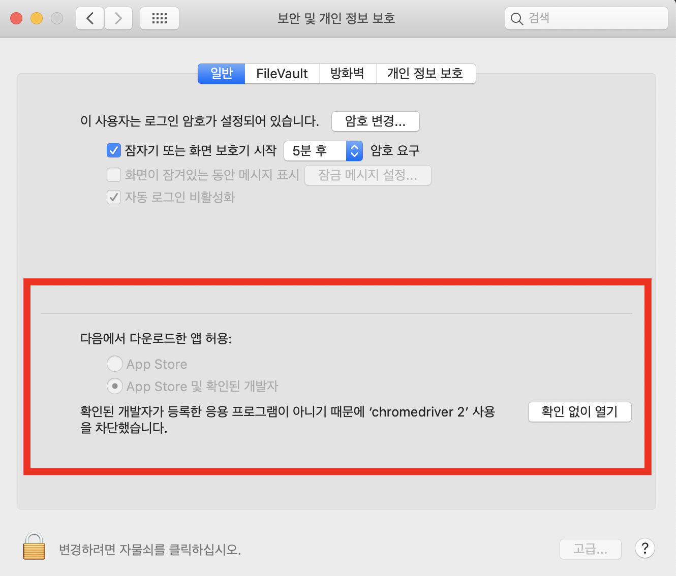 하단에 "다음에서 다운로드한 앱 허용" 항목에 평소에는 없던 항목을 볼 수 있다.