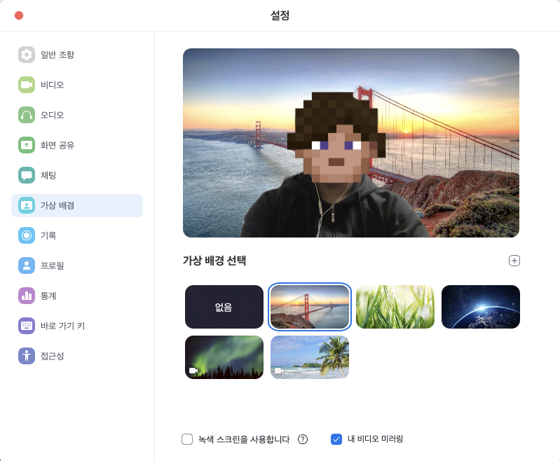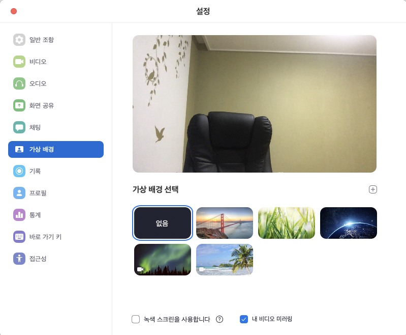 이제, 새로 열린 창에서, 왼쪽에 가상 배경이라는 메뉴를 볼 수 있으며, 오른쪽에는 변경된 배경을 선택/확인 할 수 있습니다.