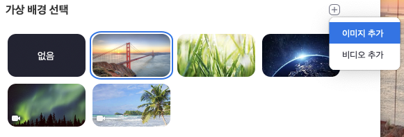 추가적인 배경을 입력하려면, "가상 배경 선택"이라는 메뉴의 오른쪽으로 보면 "+" 버튼을 눌러줍니다. 있습니다.