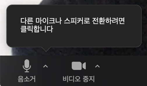 아래와 같이, "다른 마이크나 스피커로 전환하려면, 클릭합니다"라는 문구가 뜨는데, 이 때 본인에게는 소리가 안들리지만 마이크는 켜져 있는 경우가 발생할 수 도 있다. 노트북은 별 문제 없겠지만, 스마트폰은 화면이 한정적이라서 정확히 음소거로 되어 있는지 확인이 안될 경우가 있기 때문이다.