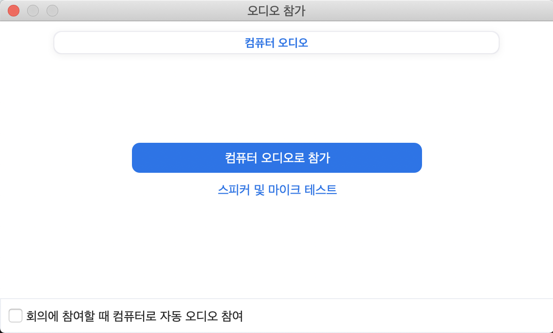 온라인 다자간 회의에서는 마이크/오디오 설정이 매우 중요하다. 따라서, 회의 시작전 오디오를 선택하도록 되어 있다.