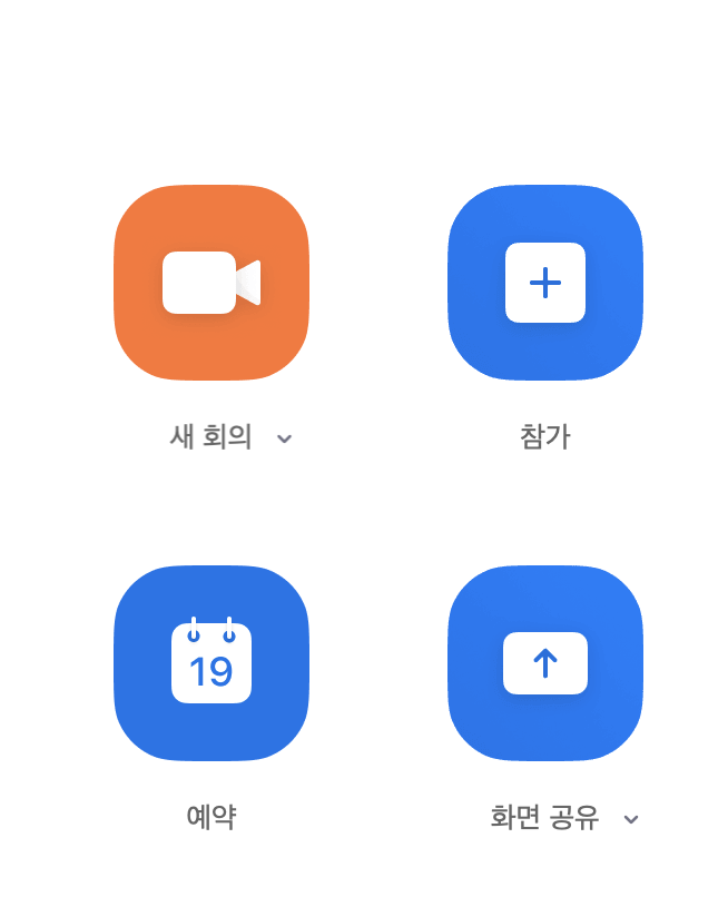줌을 새로 시작하면, 아래 왼쪽 그림처럼 4개의 메뉴를 볼 수 있습니다. 로그인이 되지 않은 경우는, 회의 코드를 입력하는 웹페이지만 보게 될것입니다.