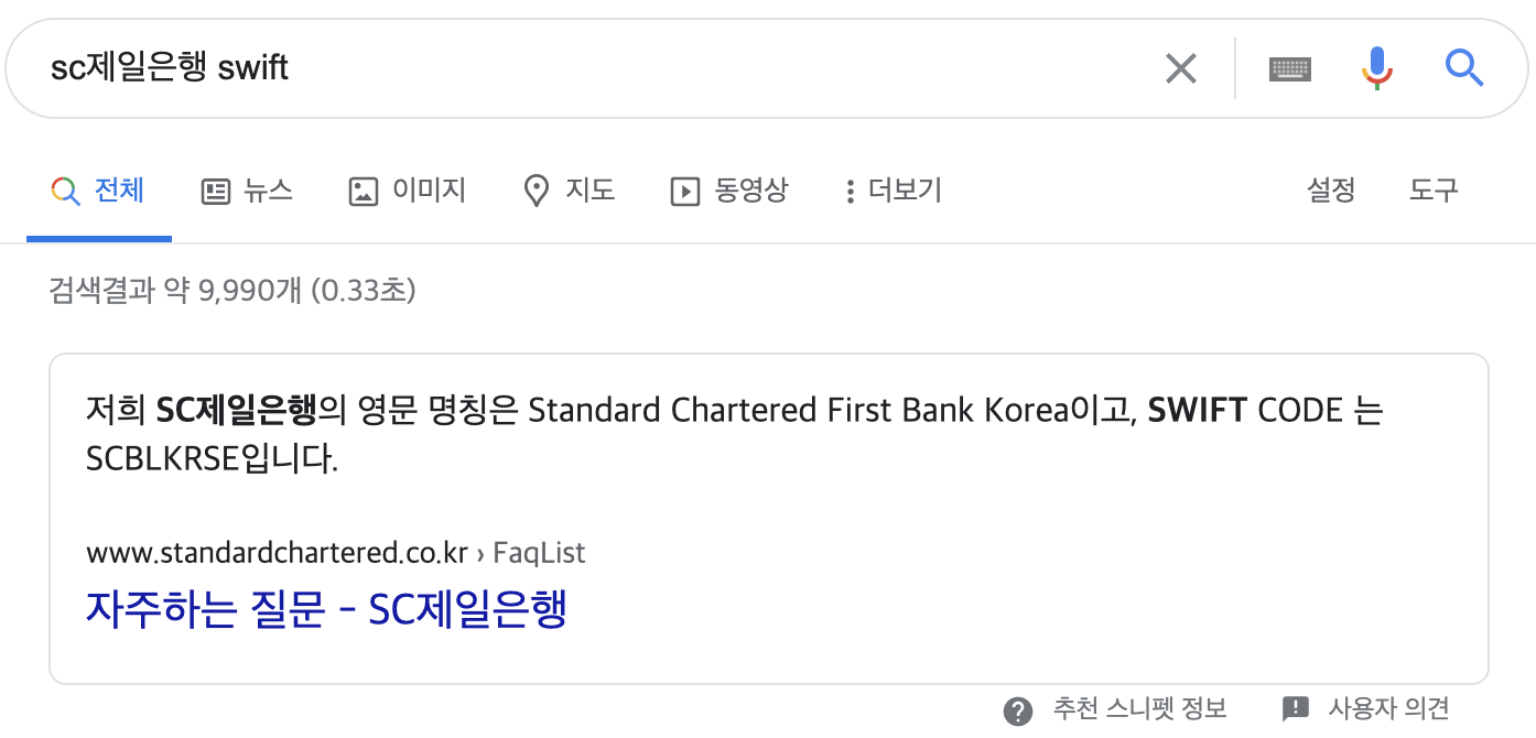 SC제일은행의 SWIFT 코드는 인터넷에서 쉽게 확인 할 수 있습니다.