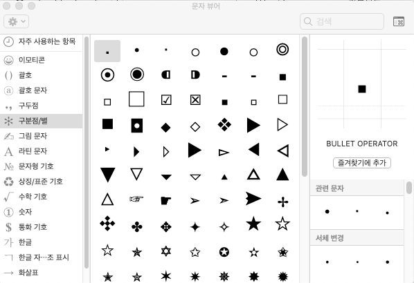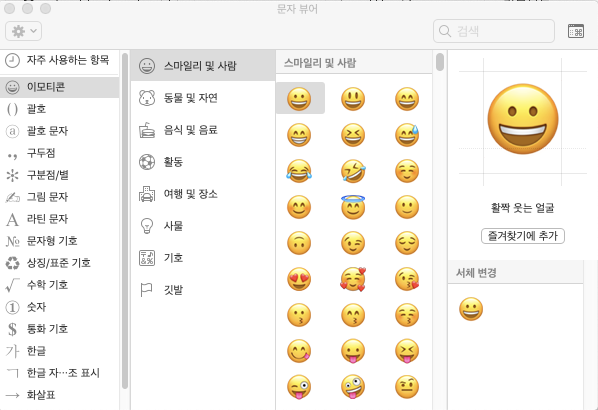 Control + Command + SpaceBar 키를 동시에 누르면 다음과 같은 특수기호 입력 창이 오픈됩니다. 여기에서 특수기호를 선택하여 입력 하면 됩니다.