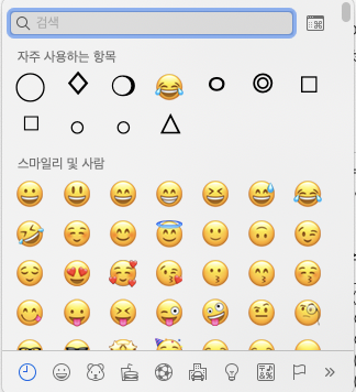 Control + Command + SpaceBar 키를 동시에 누르면 다음과 같은 특수기호 입력 창이 오픈됩니다. 여기에서 특수기호를 선택하여 입력 하면 됩니다.