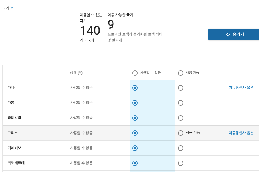 해당 메뉴에 들어가면, "국가" 영역의 우측에 "국가관리" 버튼을 눌러서 출시 국가를 선택할 수 있으니, 참고하기 바란다.