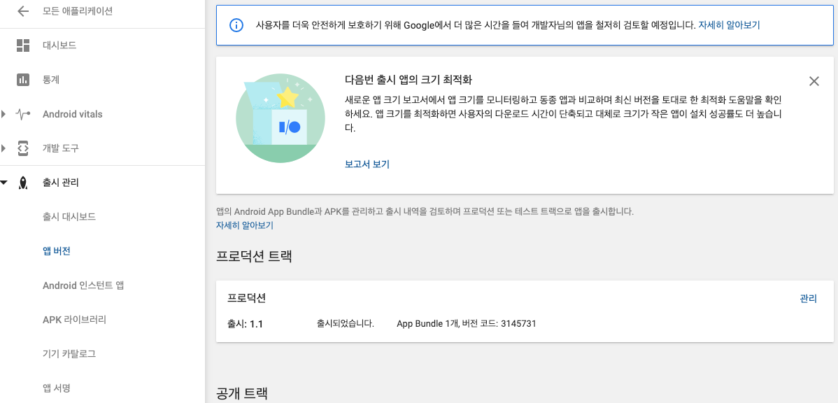 앱버전 메뉴에 들어가면, 각 트랙별로 모바일 앱을 관리할 수 있다. 본문에서는 프로덕션 업데이트를 진행하므로, 오른쪽에 있는 관리 버튼을 눌러서 메뉴에 진입하도록 한다. 다음으로 출력되는 화면에서 오른쪽 상단에 보면 "새버전 출시하기" 버튼이 보인다. 이 버튼을 눌러서 진행한다.