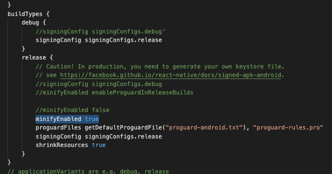 아래와 같이 android/app/build.gradle 파일의 buildTypes > release 항목에서 2개 속성값을 true로 변경 해준다.