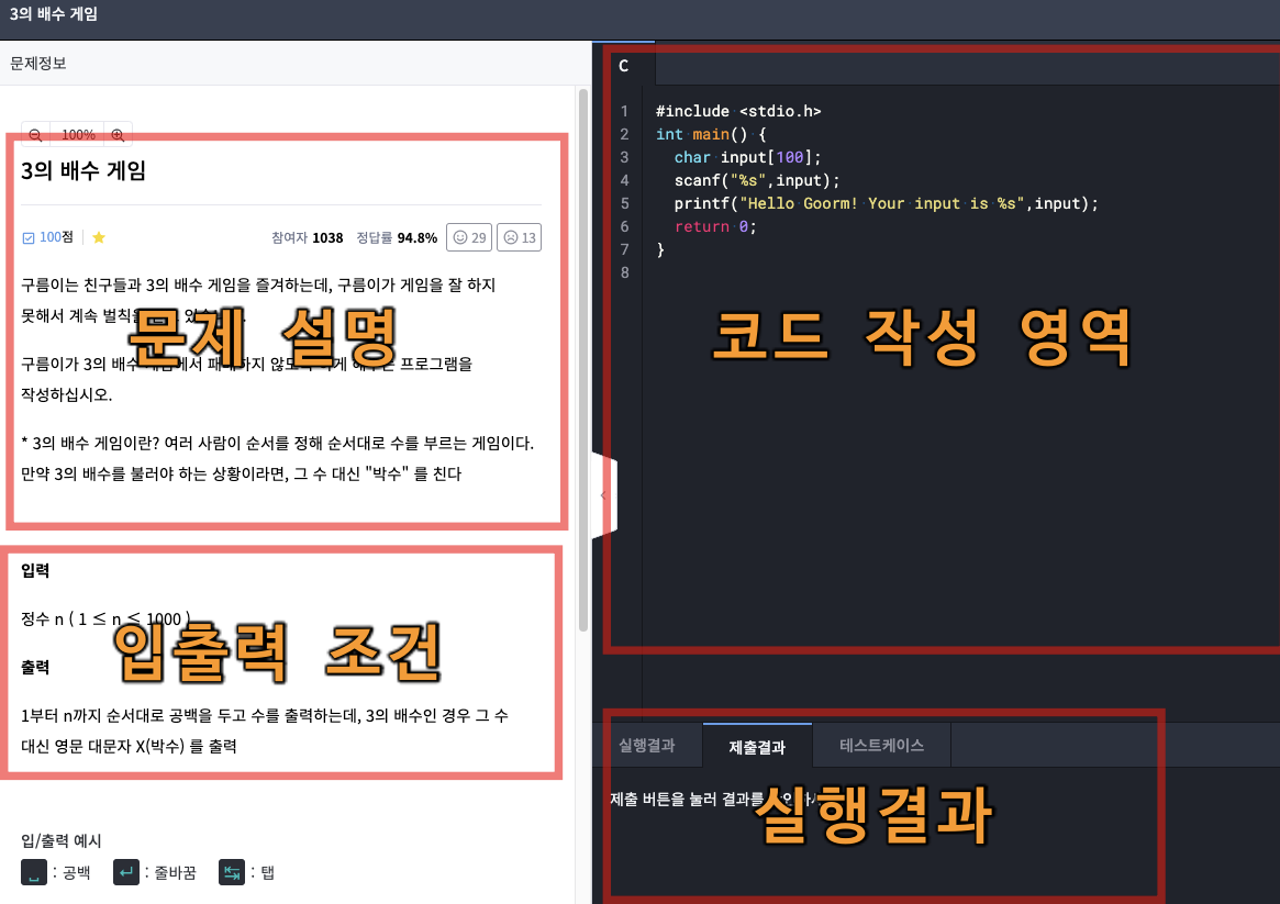 그림과 같이 실제 레벨 테스트를 열어보면, 문제의 배경을 설명, 입출력 조건 설명하는 좌측 영역과, 실제 코드를 작성하고 코드를 실행 하는 영역으로 나뉘어 있다.