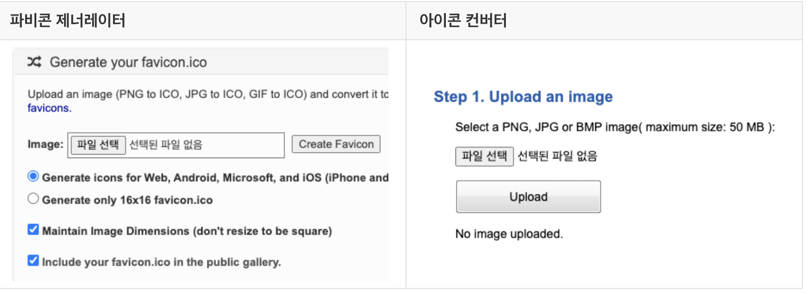 다음은 각 사이트의 화면이다. 준비한 아이콘 파일(PNG, JPG)를 업로드하여 ICO파일로 변환하면 된다.