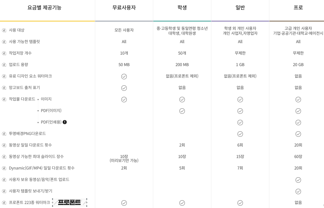 다만, 무료 사용자의 경우 워터마크와 리소스 사용에 제한이 있다. 이 제한 사항이 타 서비스 대비 상당히 많은 편이라서, 망고보드를 제대로 사용하려면 유료 서비스로 사용하는 것이 좋을 듯 하다. 다음은 사용자 등급별 차이점표이다.
