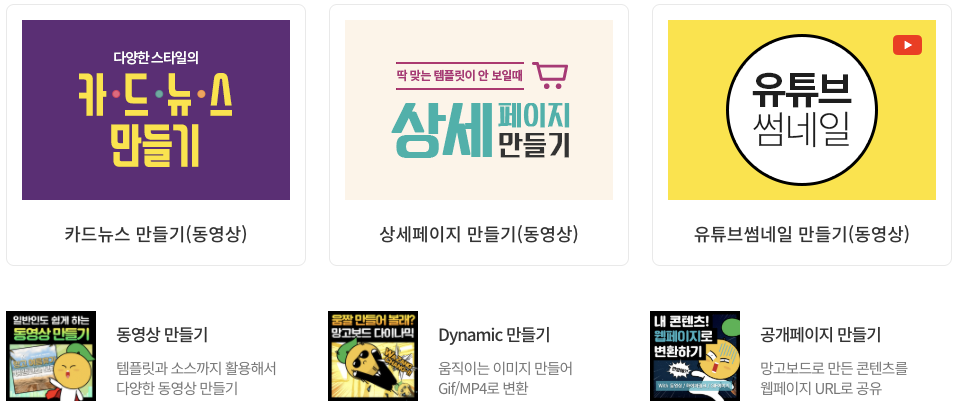 다른 서비스 대비 동영상 및 에니메이션 지원 템플릿이 더욱 강조되고 있다. 다른 서비스들이 정적인 템플릿을 보유한다면, 망고보드는 모션템플릿 (에니메이션 GIF 및 동영상)의 편집이 가능하도록 지원하고 있다. 여러 관점에서 단연 앞서나가고 있는 서비스이다.